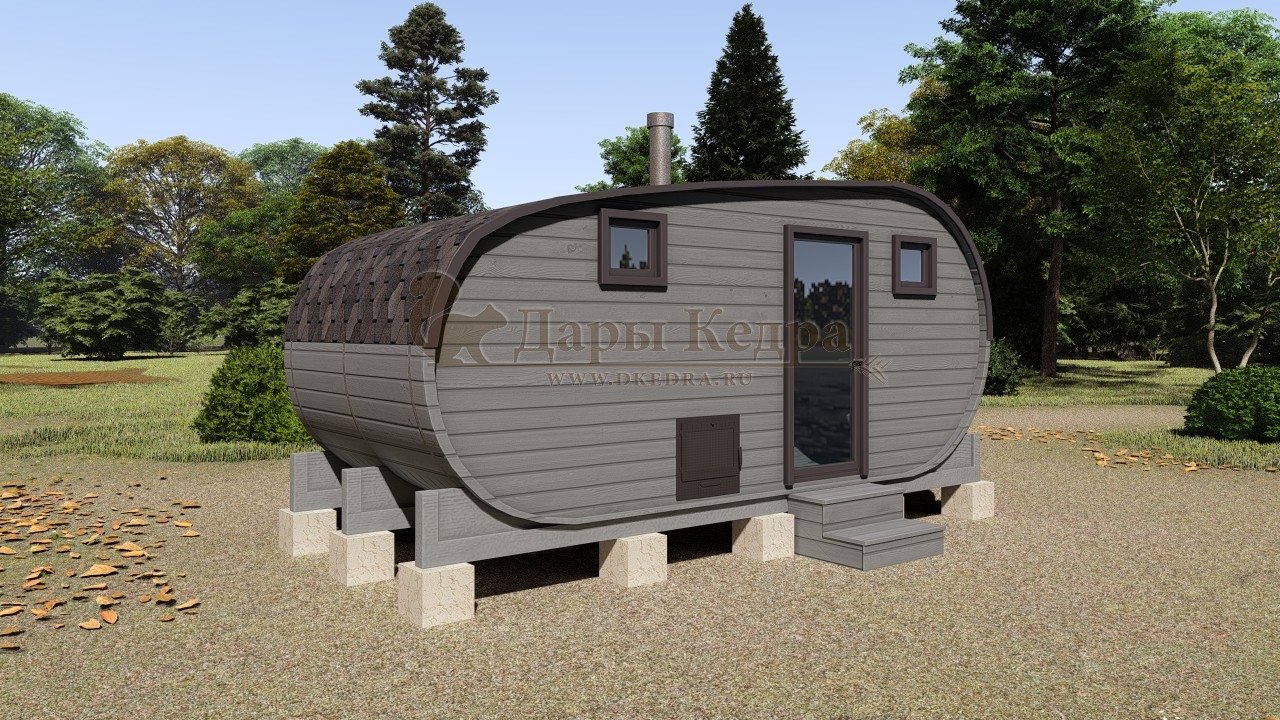 Баня-бочка круглая из кедра 2 метра Это изделие круглой вытянутой формы с одним парильным отделением. Внутреннее пространство включает в себя печь у дальней стены и лавки из кедра по обе стороны бани. За счет компактной формы баня нагревается в течение 30 минут. По вашему желанию ее можно укомплектовать козырьком, верандой и печью с внешней загрузкой, благодаря которой весь мусор после топки остается на улице. Круглая баня-бочка не требует полноценный фундамент, поэтому при необходимости ее можно перенести в другое место. Обращаем Ваше внимание, что в стандартную комплектацию бани входят лавки в парной с обеих сторон. Дополнительно можно заказать полок открытого или закрытого типа! Кедр обладает ароматическими свойствами. Он не деформируется и влагоустойчив, при правильном уходе за деревом на нем не развиваются грибки и плесень.