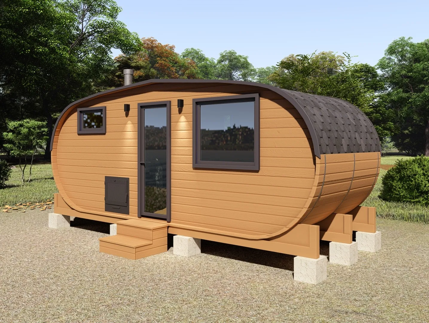 Баня-бочка «Орео» с боковым входом и панорамным окном Стильная и современная баня-бочка с боковым входом может быть выполнена длиною от 4 метров, что-бы было два отделения (парилка и комната отдыха). Полок может быть, как с двух сторон, так и угловой, в стандарте одноуровневый. Печь в данной модели расположена сбоку с топкой наружу, либо внутрь парилки. Печь можно укомплектовать баком для воды, а саму баню сделать длиною до 6 метров, комфортно разместив в ней дополнительно помывочную. В эту модель включено два закаленных стеклопакета: круглое и полукруг, которые мы можем разместить на ваше усмотрение в парилке и комнате отдыха. Обращаем Ваше внимание, по умолчанию в данной модели отсутствует бак для воды, вместо него идёт утеплённая термо-труба, которую можно заменить на бак по желанию.