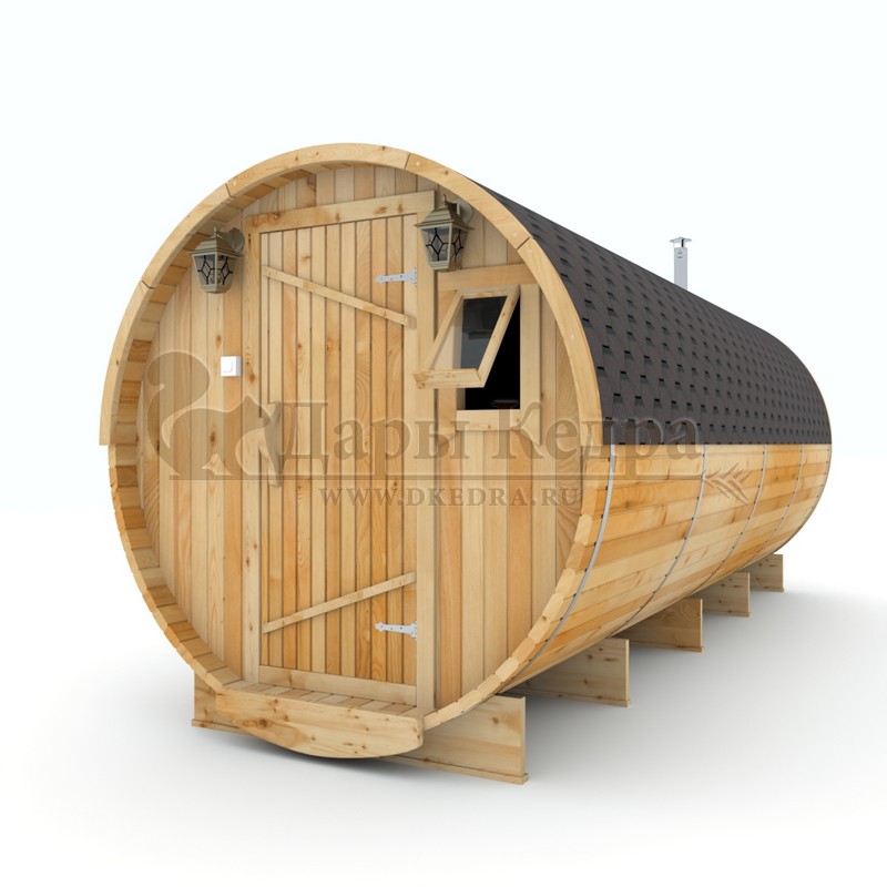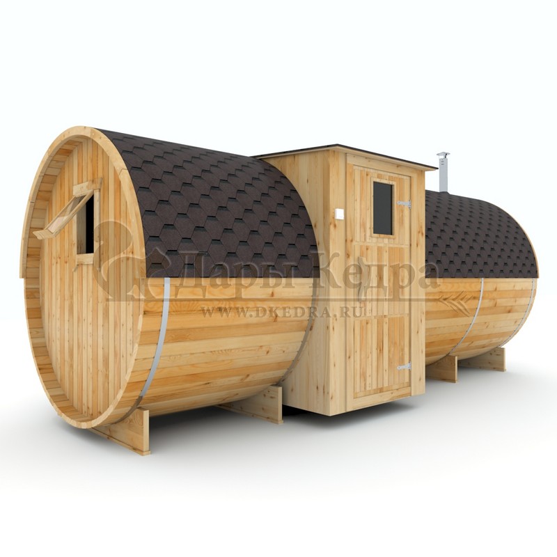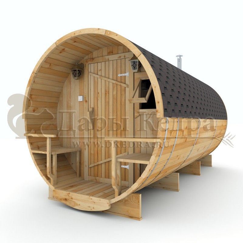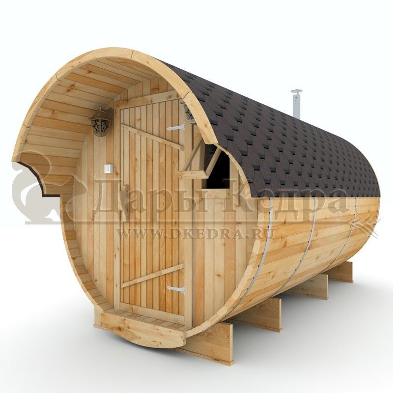 Баня-бочка буханка из кедра с козырьком (все размеры) Баня-буханка более просторная за счет увеличенной высоты потолков и ровного пола. Козырек не только украшает баню, но и защищает оставленную обувь от дождя. Лавочки из кедра находятся по всей длине бани-бочки с обеих сторон. Печь расположена в парилке около дальней стены. Время растопки такой бани не превышает 30 минут. В зависимости от выбранного размера баня-бочка буханка с козырьком имеет следующую комплектацию: Баня-бочка буханка 2,5 метра - парилка; Баня-бочка буханка 3,5 и 4,5 метра - раздевалка, парилка; Баня-бочка буханка 5,5 метров - раздевалка, парилка, моечная. По вашему желанию ее можно укомплектовать печью с внешней загрузкой, благодаря которой весь мусор вовремя топки остается на улице. Баня-бочка буханка не требует полноценный фундамент, поэтому при необходимости ее можно перенести в другое место. Обращаем Ваше внимание, что в стандартную комплектацию бани входят полки открытого типа в парной с обеих сторон. Дополнительно можно заказать полок закрытого типа или лавку! Кедр обладает ароматическими свойствами. Он не деформируется и влагоустойчив, при правильном уходе за деревом на нем не развиваются грибки и плесень. , ,