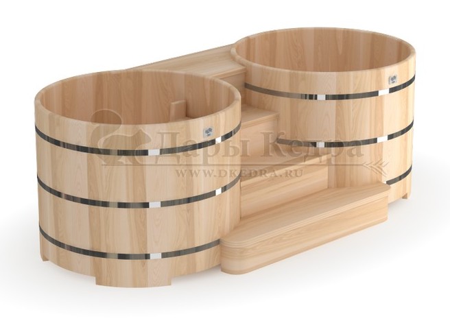 Двойная купель из кедра чаще всего используется в крупных банных комплексах и оздоровительных центрах. Она представляет собой две круглые чаши для воды, в которых люди отдыхают после парения. Между купелями установлен широкий подиум из кедра, по которому могут спускаться и подниматься сразу несколько людей. Для комфортного отдыха купель оснащена лавочками и двумя дополнительными лестницами. За счет стяжных болтов обручи из нержавеющей стали плотно прилегают к кедровой купели. Это позволяет равномерно распределять нагрузку воды и сохранить форму изделия в период эксплуатации. При правильном уходе купель для бани не рассыхается и не подвергается гниению.