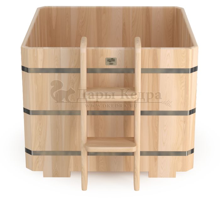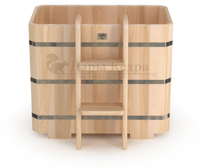 • Прямоугольная купель для бани из кедра Представляет собой герметичную емкость для воды из кедра, которая предназначена для отдыха и охлаждения тела после процедур парения. Ширина прямоугольной купели равна ширине стандартных дверных проемов (78 см), поэтому занести в помещение ее можно в собранном виде. Благодаря прямоугольной форме купель хорошо впишется в угол помещения. Так же ее можно установить на улице. Прямоугольная купель оснащена лавочками, приставной и внутренней лестницей из кедра. Обручи из нержавеющей стали плотно прилегают к изделию, что позволяет равномерно распределить нагрузку воды и сохранить форму во время эксплуатации. При правильном уходе купель для бани не рассыхается и не подвергается гниению. При взаимодействии древесины кедра с водой активируются эфирные масла и фитонциды, благодаря чему организм насыщается полезными веществами.