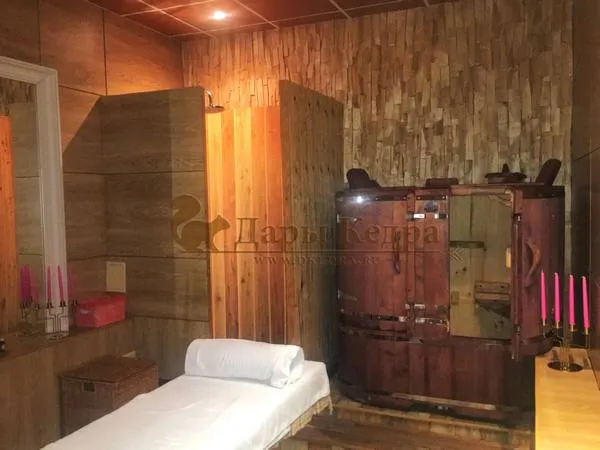 Для того, чтобы фитобочка в салоне красоты была не только местом для оздоровления, но и объектом всеобщего внимания и восхищения, многие стараются декорировать свою небольшую парную резьбой или цветовым покрытием, или дополнительными деревянными аксессуарами, выполненными в едином стиле с бочкой. Далее покажем несколько интересных примеров дизайна и расположения фитопарной у клиентов-партнеров компании Дары Кедра.